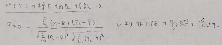 ここでは標本を用いた3つの相関係数を解説します。まずはピアソンの標本相関係数です。最もポピュラーですが、外れ値に影響を受けやすいデメリットがあります。