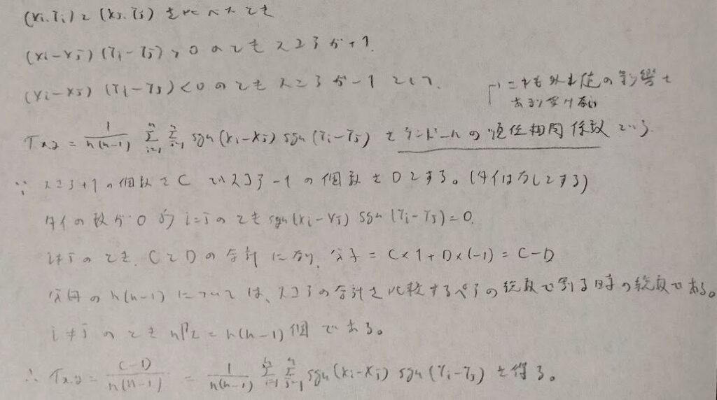ケンドールの順位相関係数もロバストな方法です。こちらは符号を重視した方法になります。ピアソンの標本相関係数からは最も考えが遠い方法だと感じています。
