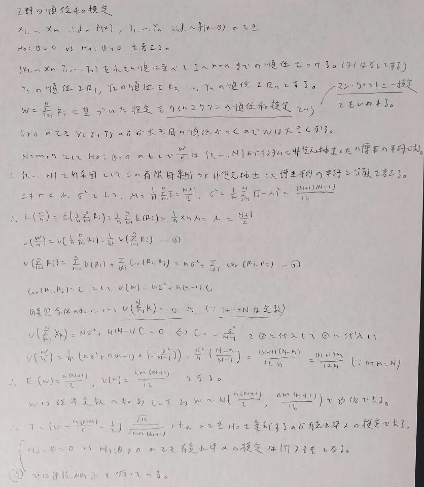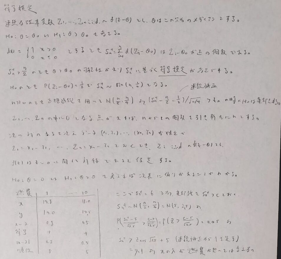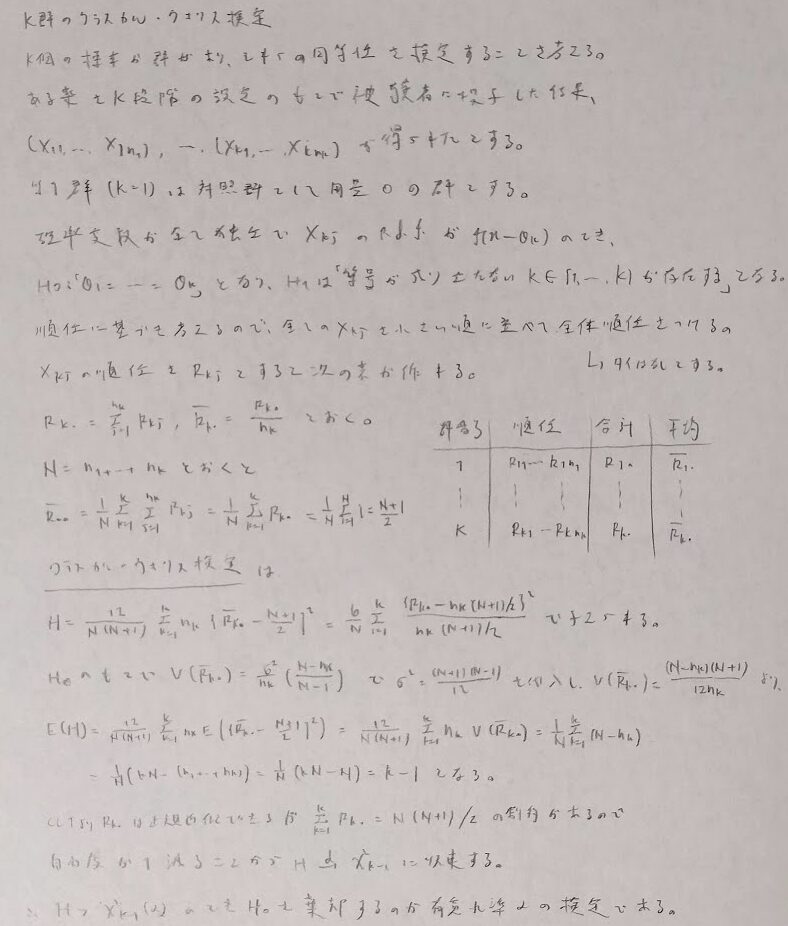 符号検定(シンプル)→符号付き順位和検定(より詳しく)→ウィルコクソンの順位和検定(2群)→クラスカル・ウォリス検定(3群以上)→コルモゴロフ・スミルノフ検定(グラフの同一性)→蓮検定(ランダム性)の流れのイメージで進めます。