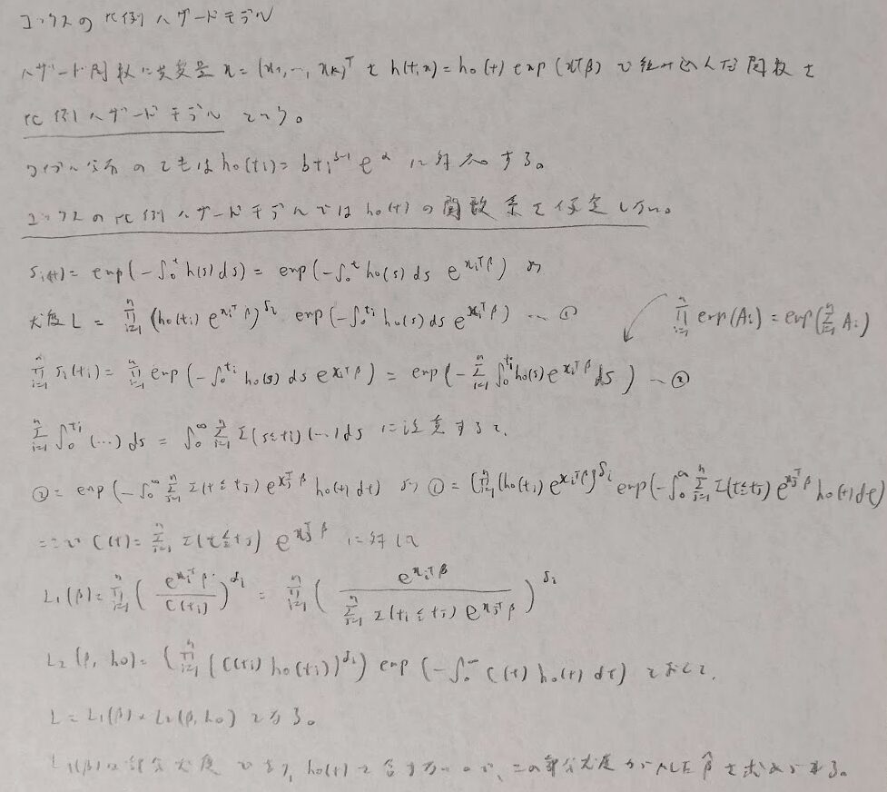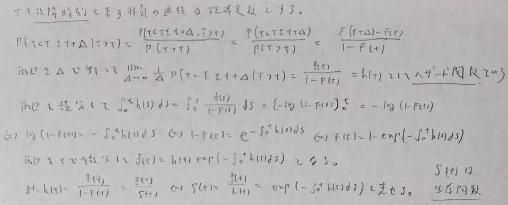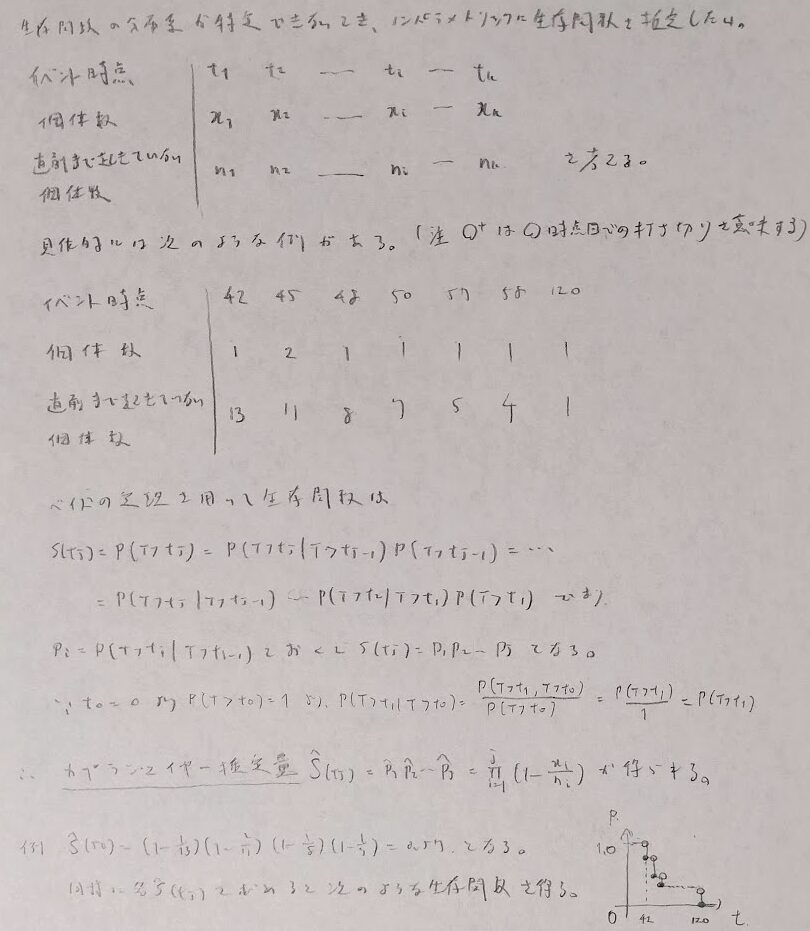 生存時間解析の理論を学びます。つまりハザード関数を用いて確率密度関数や分布関数、生存関数が表現できることを学び、そして生存関数を推定するカプラン・マイヤープロットを学習します。