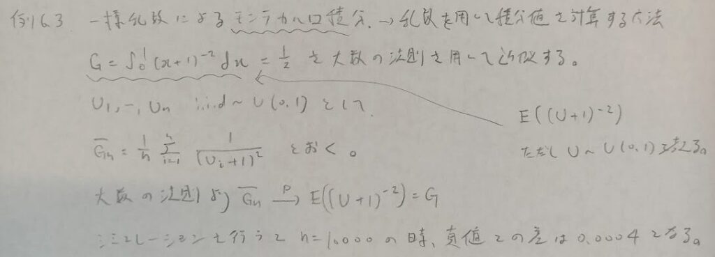 大数の法則は積分計算の近似としてモンテカルロ積分を適用する際に大活躍します。積分計算の結果を保証するために大数の法則があります。