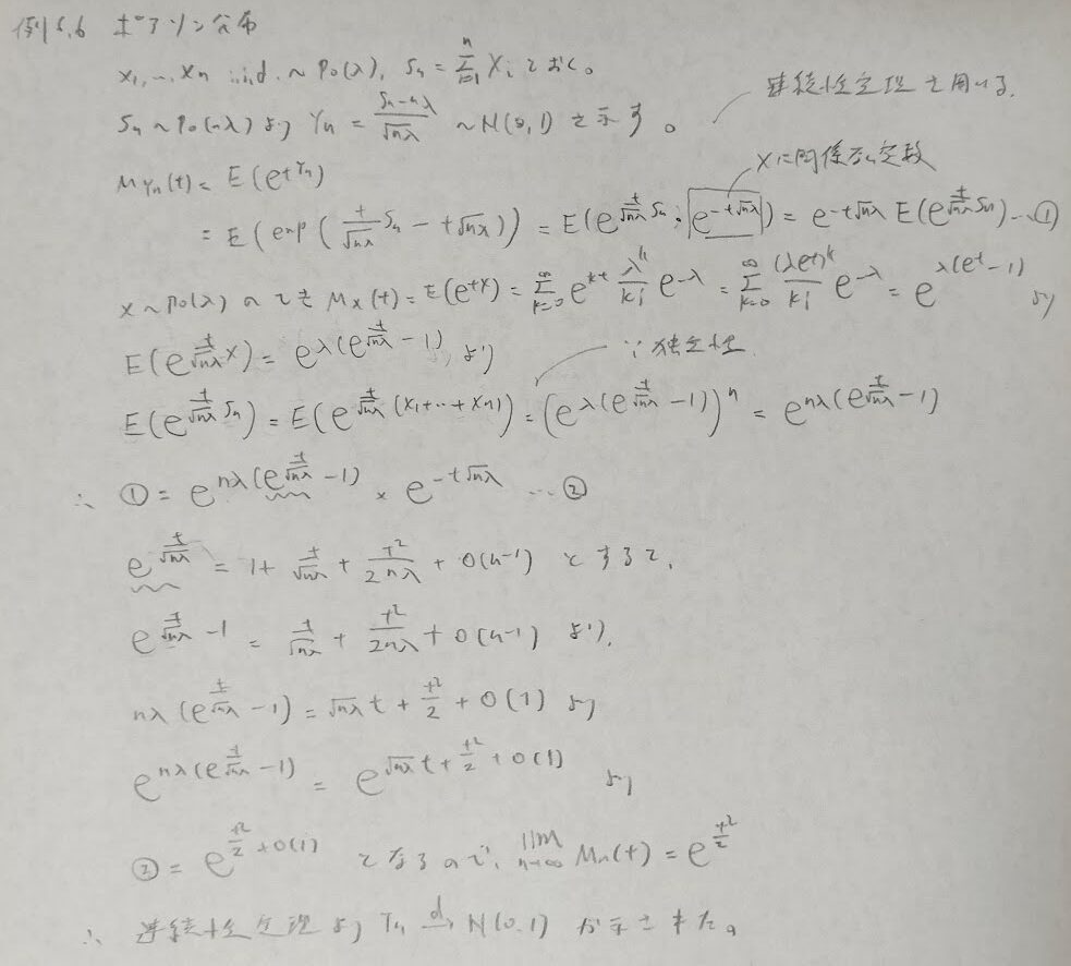 細かいことを置いておくと、連続性定理とは積率母関数が収束→分布関数も収束という内容です。次の例ではポアソン分布において中心極限定理が成り立っていることを示しています。