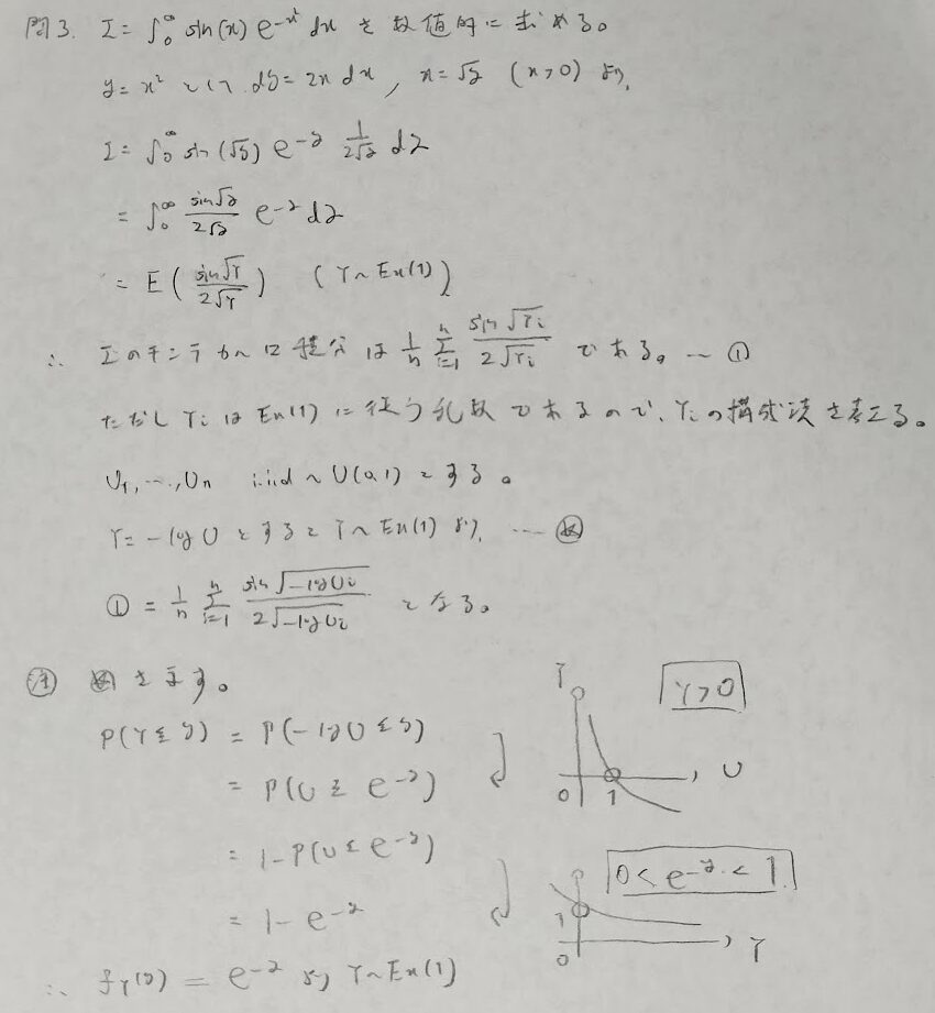 本問はアクチュアリー数学におけるシミュレーションの内容(逆関数法の一例です)であり、統計検定1級にも類題が出題されています。この問題は1問として扱っていますが、実際の試験では何問かに分割されて出題される形式になる傾向があります。
