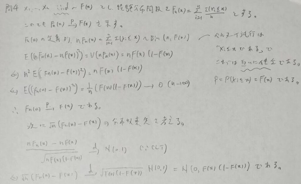 (3)の考え方がポイントです。漸近分布が従う密度の分布関数を求めています。著者の模範解答では逆の不等号からスタートしていましたが本質は変わりません。