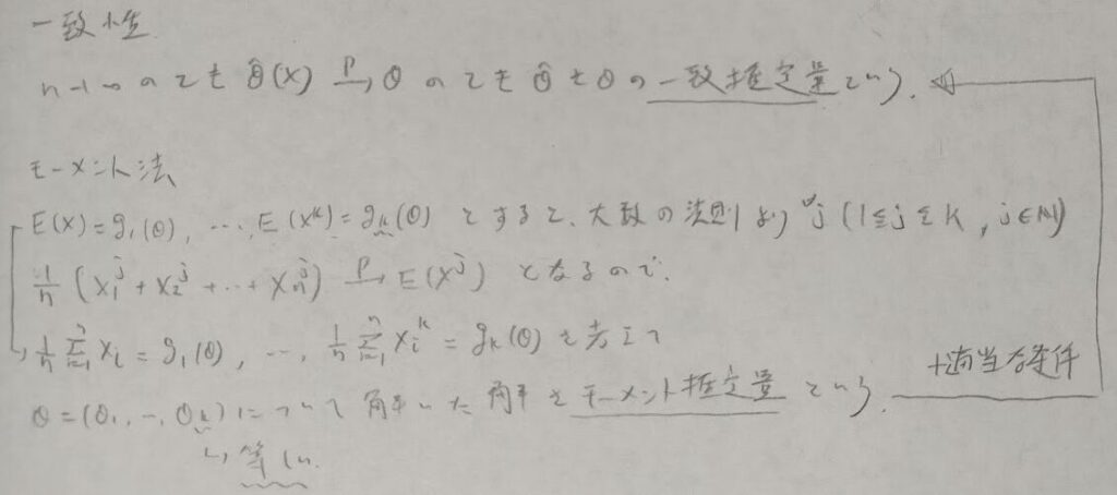 推定量にはさまざまな種類がありますが、直感的に理解しやすい一致推定量をまずは例にとります。一致推定量は確率収束で定義されます。また関連性があるのはモーメント推定量です。こちらも大数の法則が関連しています。モーメント推定量に適当な条件を加えた推定量は一致推定量になります。しかし『データ解析のための数理統計入門』ではその適当な条件の詳細は範囲外となります。