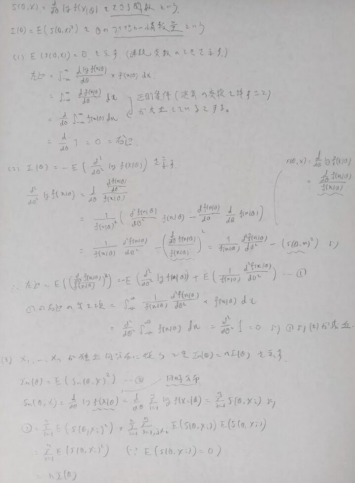 対数尤度から話は広がります。対数尤度の推定量で微分したものをスコア関数といい、その2乗の期待値をフィッシャー情報量といいます。スコア関数の期待値は0であることは重要な定理です。