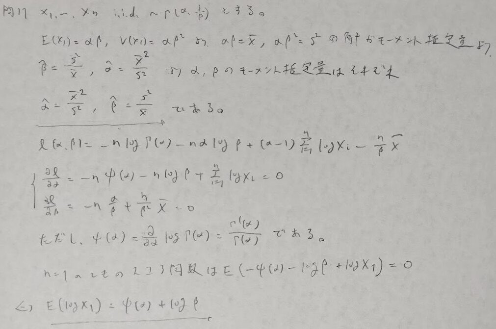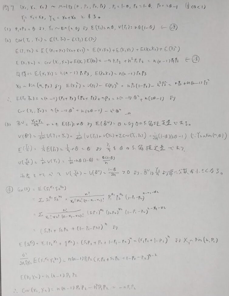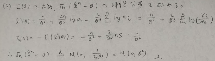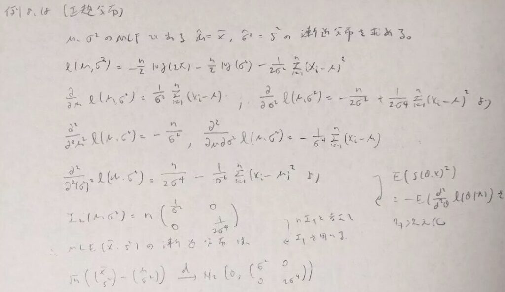 まずフィッシャー情報量行列は対称行列であるので余計な計算を避けましょう。またフィッシャー情報量行列の各成分計算では、2階微分を用いて計算を簡略化します。その代わりマイナス符号がつくことにも注意です。そしてフィッシャー情報量行列はnが入った式ですが、漸近分散の結果ではnは省かれます。