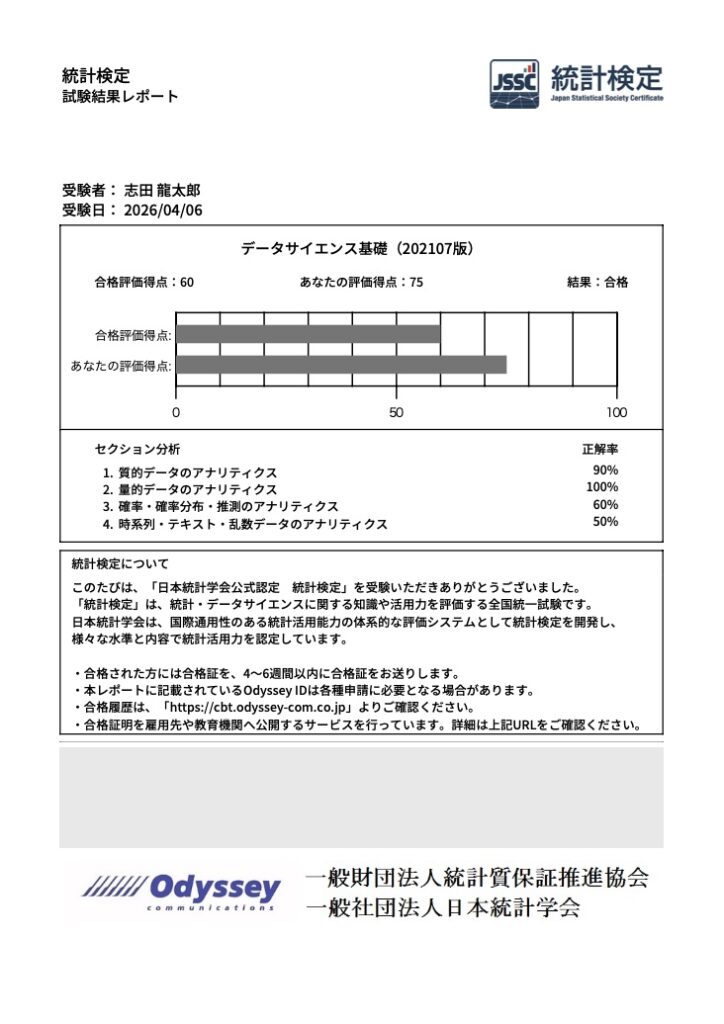 2026年4月6日にデータサイエンス基礎を受験して75点で合格できました。学習期間は10日以内でした。この検定はエクセルを用いた統計検定2級レベルのデータ分析をこなせるかどうかを試す、ビッグデータの重要性が唱えられている現代にとって有用な資格です。僕自身、エクセルでこんなことができるのか!すごい!と思う連続でした。多くの方にお勧めできる検定です。本記事ではDS基礎の学習方法について主に解説します。