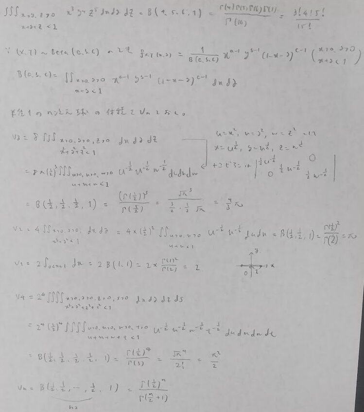 最後にディリクレ分布の応用としてn次元単位球の体積計算を行なっておきます。