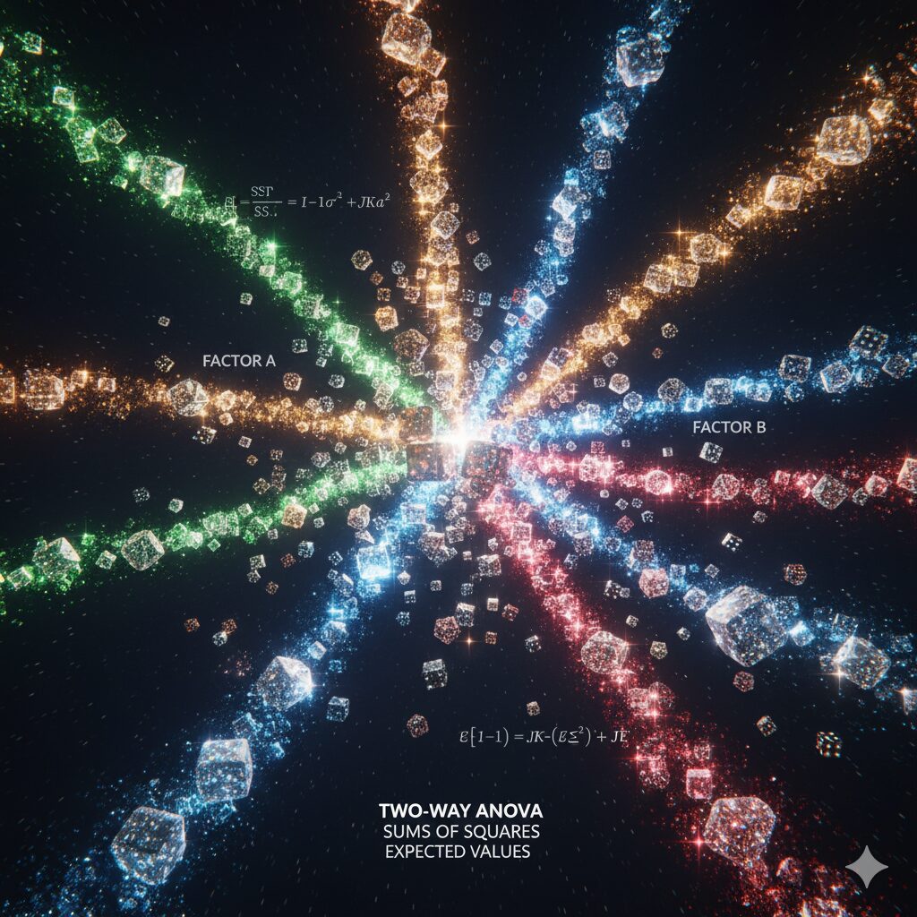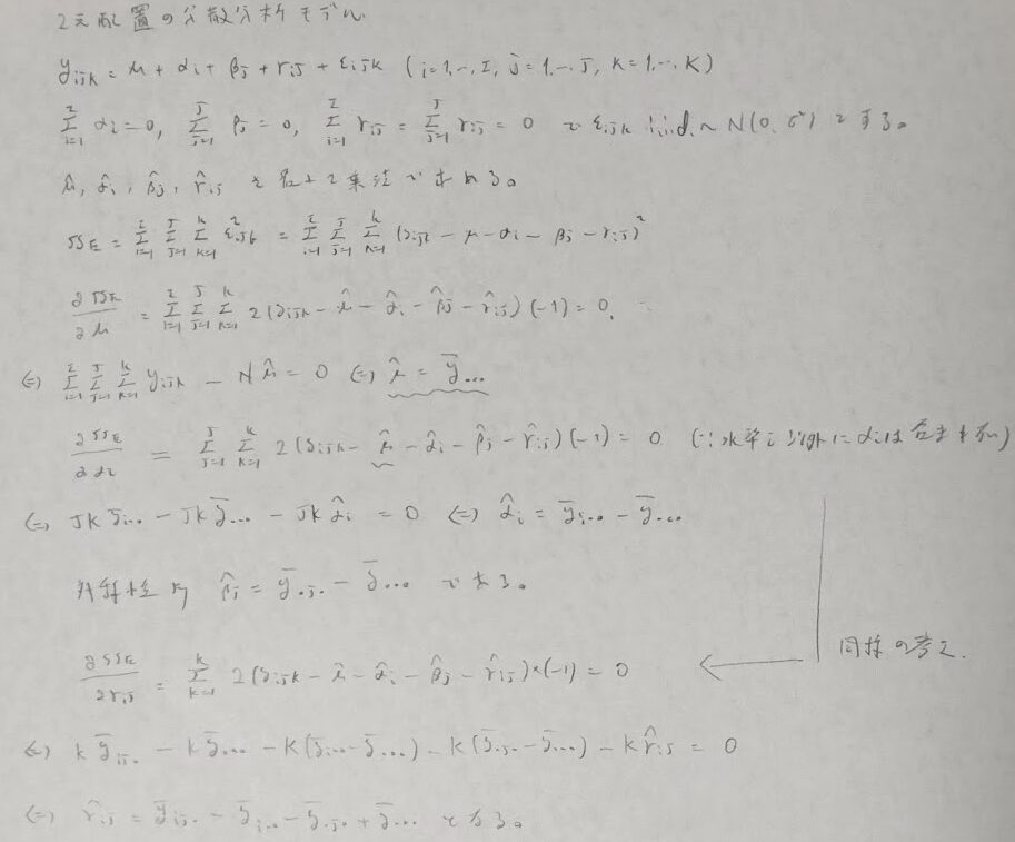 本記事では1元配置モデル→多重比較検定→2元配置モデルというシンプルな構成になります。ただし多くの学習者が避けがちな平方和の期待値など数学的に込み入った内容についてこちらで途中式などを詳しく解説しております。