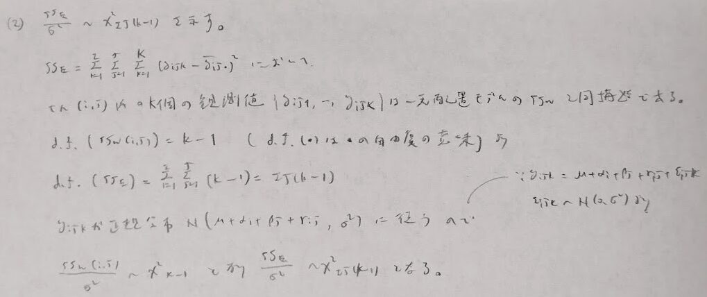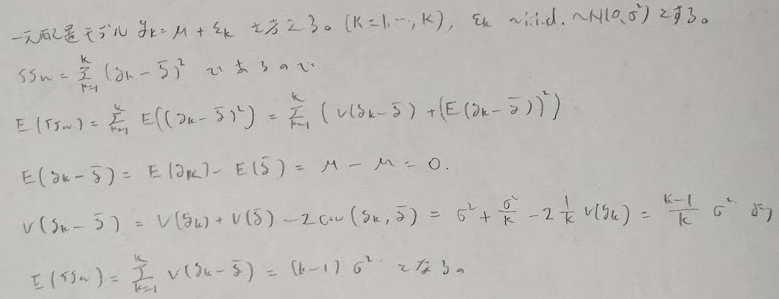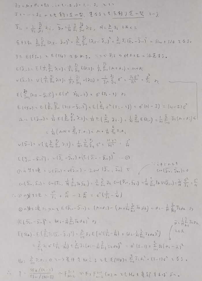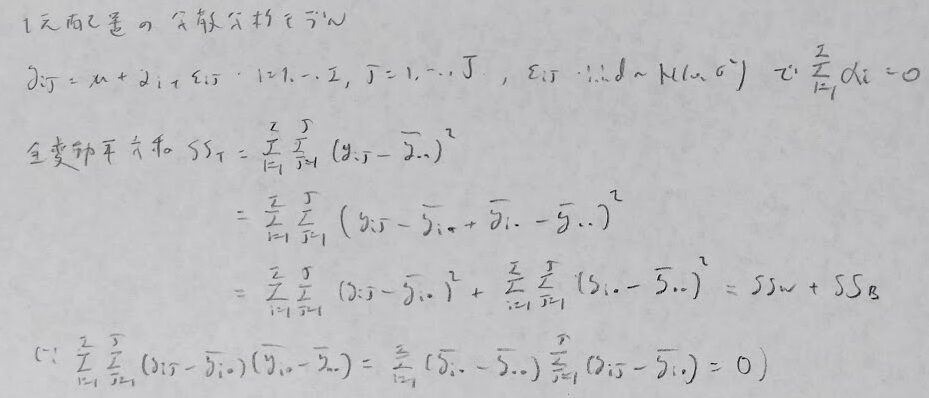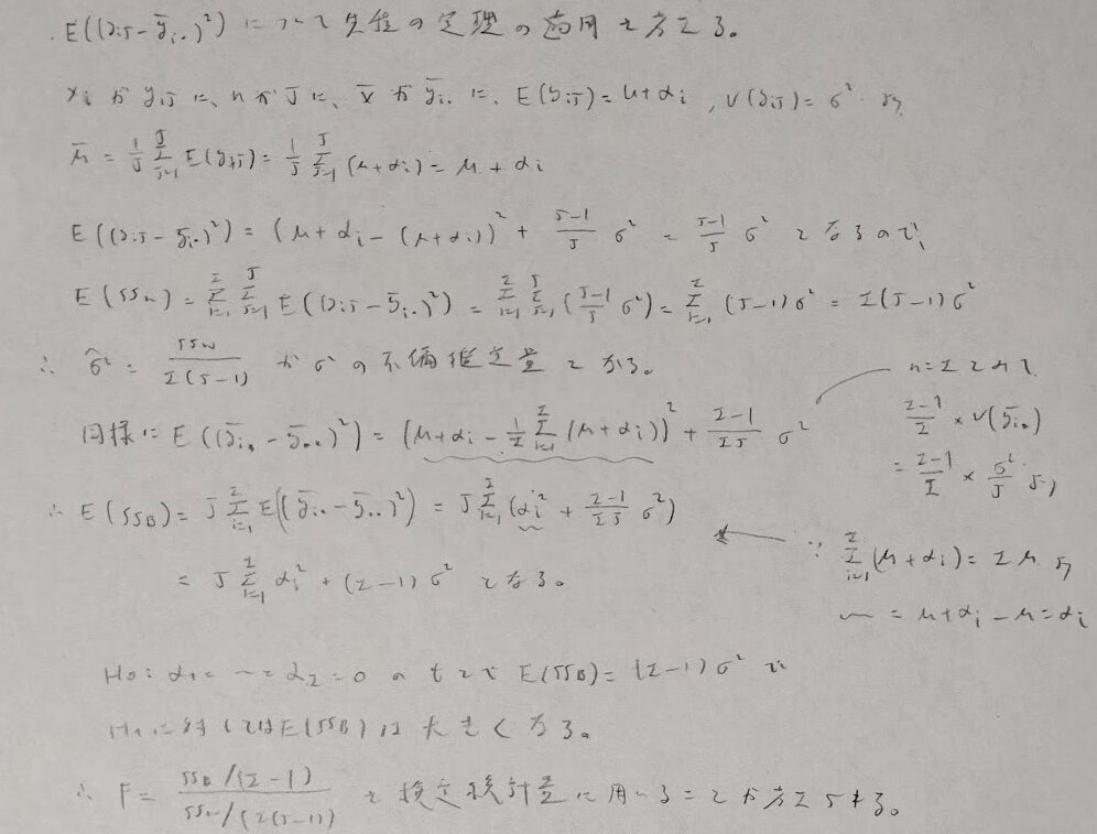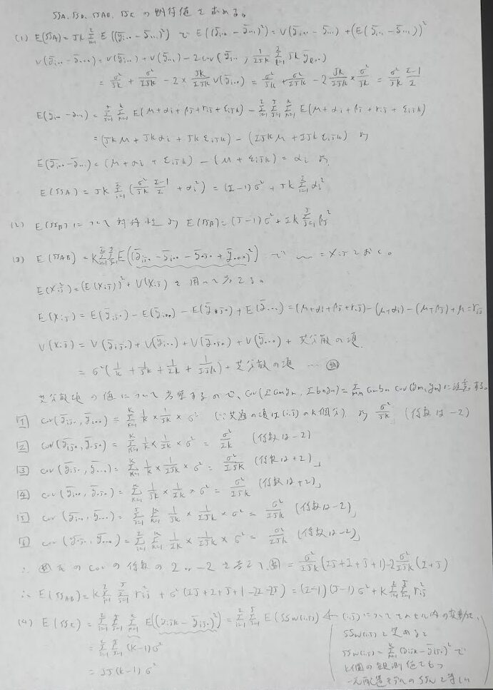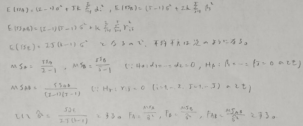 平方和の分解を行ったあとに各平方和の期待値を計算します。その結果、分散分析表に記入すべき事柄が少しずつ見えてきます。