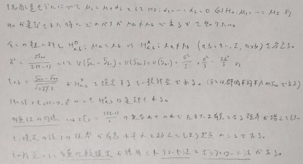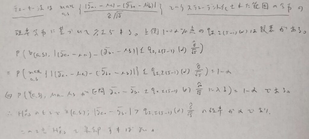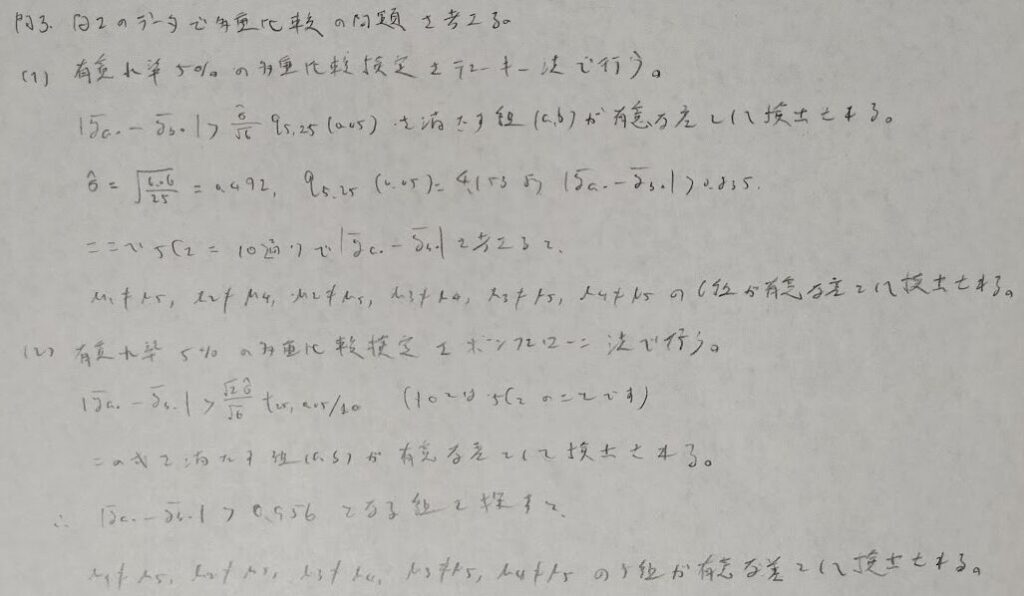 テューキー法とボンフェローニ法での有意差を決める不等式の形は覚えておかないと解けません。なぜこうなるのかは記事の前半の参照をお願いします。