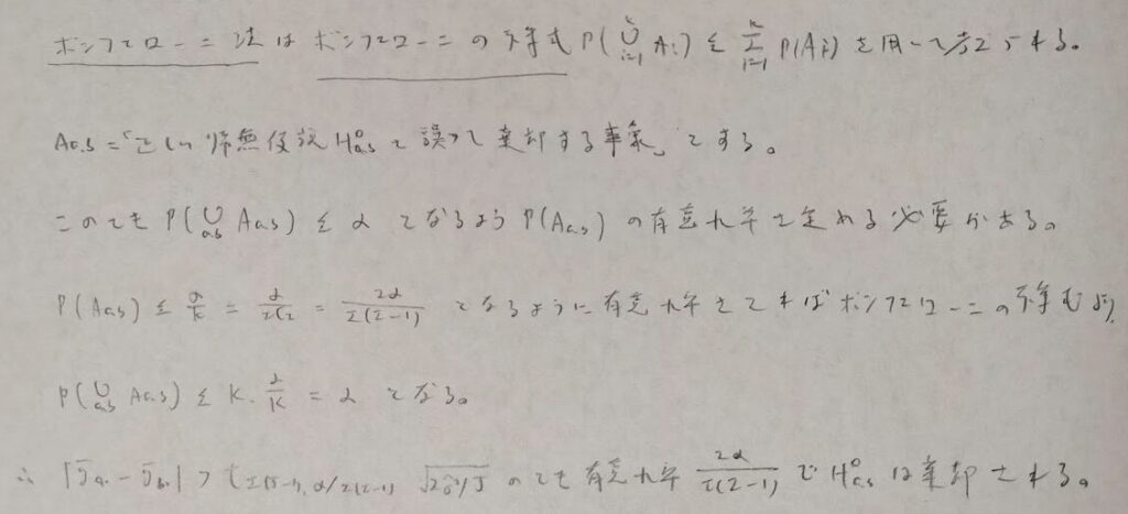 次にボンフェローニ法を考えます。これはボンフェローニの不等式から導き出される方法です。