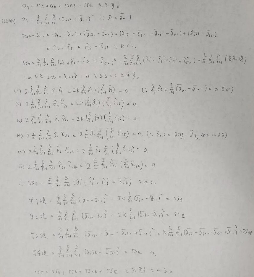 次に平方和の分解を行います。一般平均や主効果や交互作用効果には観測値から得られる推定値を導入して考えます。交差項が0となることがポイントになります。